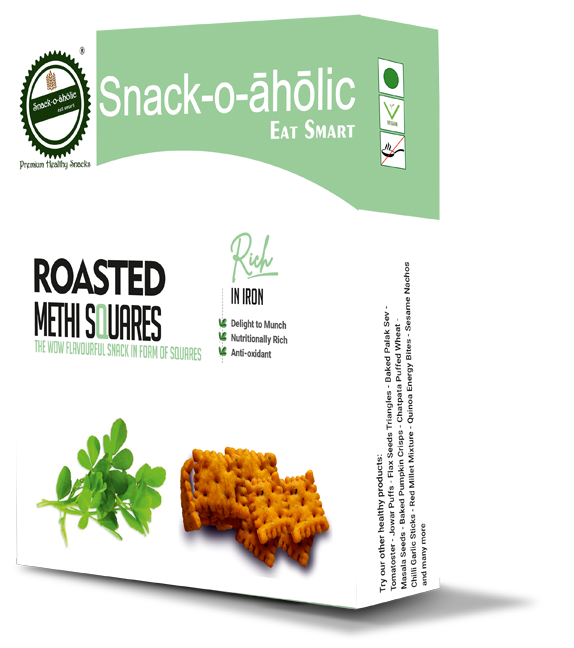The wow flavourful snack in form of square.No Oil, No Preservatives, No Maida, No added Colors or Flavors, No Sugar, and Vegan.Get your snack upgraded with our flavourful snack in form of squares.What is it made of?Our farm-fresh methi is blended with a combination of chatpata Indian masalas to get this complex fusion of snacks.Why should you eat this?Methi is a good source of nutrition. It is High in Iron content.